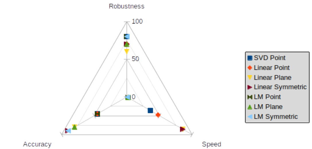 - Approximation via linearization: Here we assume that the two objects are already well aligned, i.e., that the rotation between them is small, which then allows us to find a solution by solving a linear system of equations. Out of all the methods, linearization is the fastest, but due to its assumption of small angles, robustness and accuracy suffer.